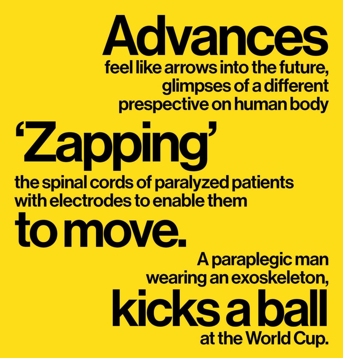 Advances like this feel like arrows into the future, glimpses of a different perspective on the human body. In this light, nothing could be more symbolic than the first kick of this year’s World Cup, taken by Juliano Pinto, a paraplegic man, wearing an exoskeleton. The cap he wore on his head communicated brain signals to a computer in the robotic suit’s backpack that commanded the legs to move, which they did by hydraulics. He kicked the ball.