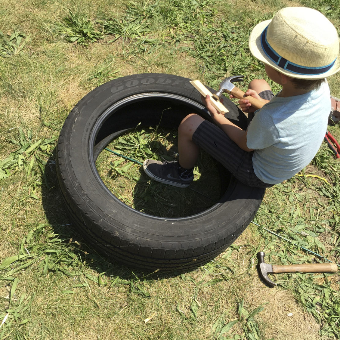 In an instant, S is gone. He disappears behind the spaceship-looking structure that was built the day before from wood, a piece of grey fence, what looks like a carpet, a broken umbrella, an old-style telephone, a shiny shower head, a few tyres and a duck head.